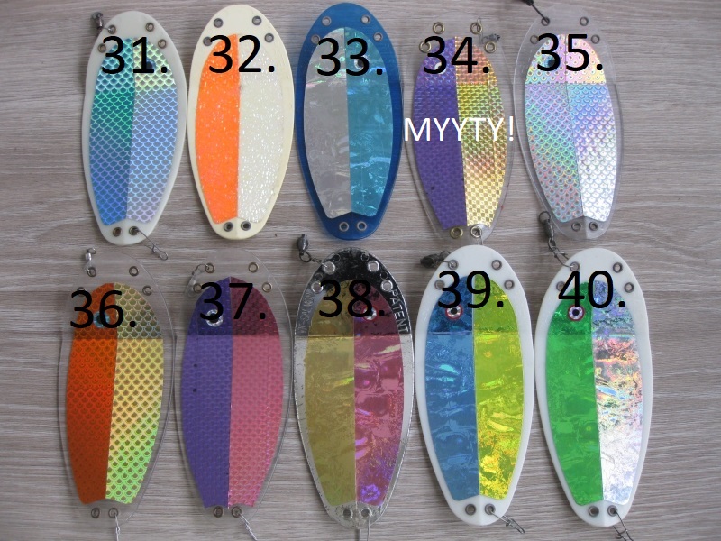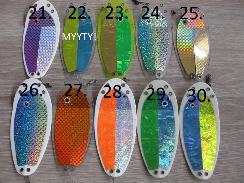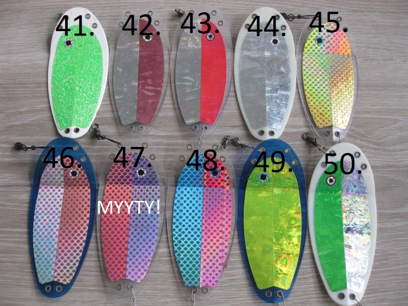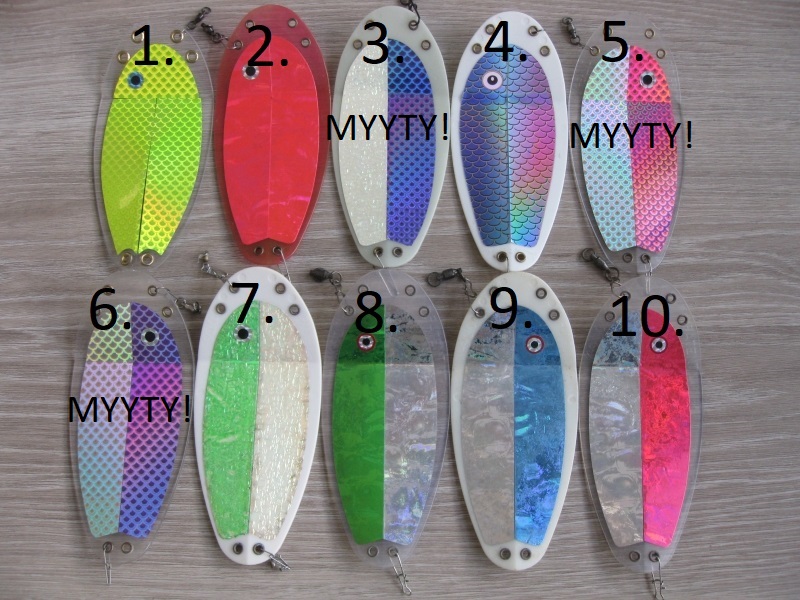 Myydään VK -Salmon houkutuslevyjä. Ovat isompaa mallia, joten levyllä mittaa 20cm. Levyt ovat käytettyjä, mutta hyväkuntoisia. Mukana vanhempia värejä, joita ei ole enää tarjolla.